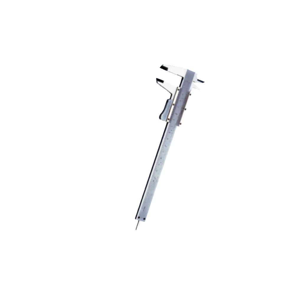 Modello corsoio con bloccaggio a pulsante Acciaiospeciale trattato inox Lunghezza totale mm 250 - Misura utile mm 150 Lunghezza becchi mm 40 Misurazione minima mm 1/20