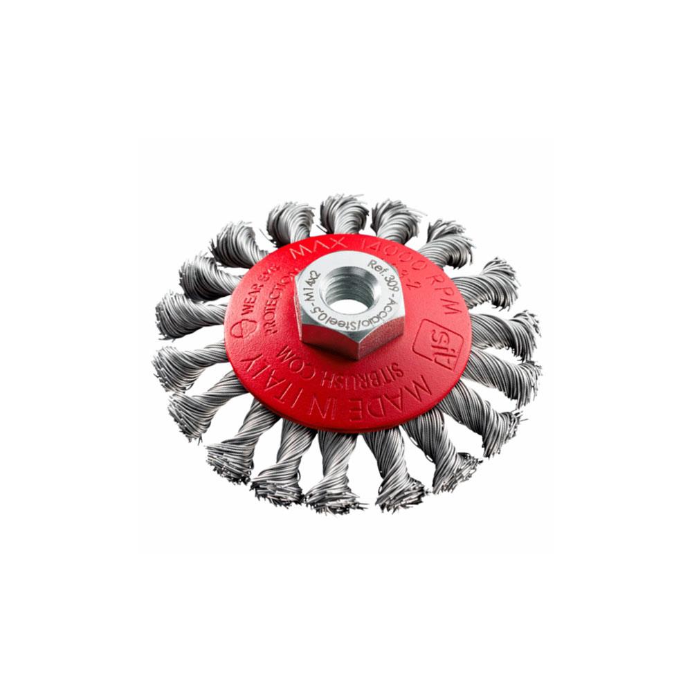 Spazzola conica con foro filettato MA14 F Fili acciaio ritorti mm 0,50 mazzetti 18 Diametro mm 95/120 Altezza fili mm 20/22 Adatta per lavori su superfici irregolari