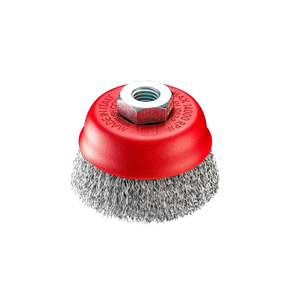 Spazzola a tazza con foro filettato MA14 F Fili acciaio ondulati mm 0,30 Diametro mm 80/100/120/150Altezza fili mm 30/35 Adatta per pulizia metallo,legno, pietre