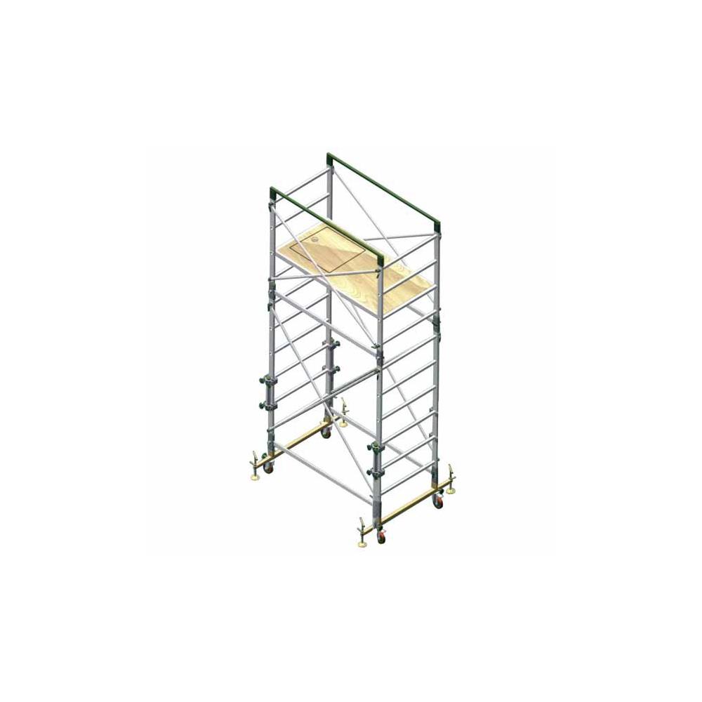 Struttura alluminio - Dimensioni cm 160x75 h 335 Piano lavoro con botola - 4 ruote 125 con freno 4 livellatori a vite - Composizione: 2 basi, 2 spalle 1800/6, 2 spalle 1200/4, 4 saette 2100, 4 saette1750, 4 traverse, 1 piano - Portata 150