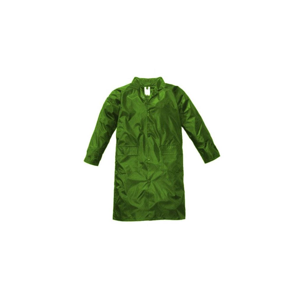 Tessuto nylon impermeabile interno spalmato PVC Cappuccio fisso con cordino a scomparsa Aerazione su dorso e sotto ascelle Chiusura con bottoni automatici - Colore verde Maniche con soffietto controvento - 2 tasche