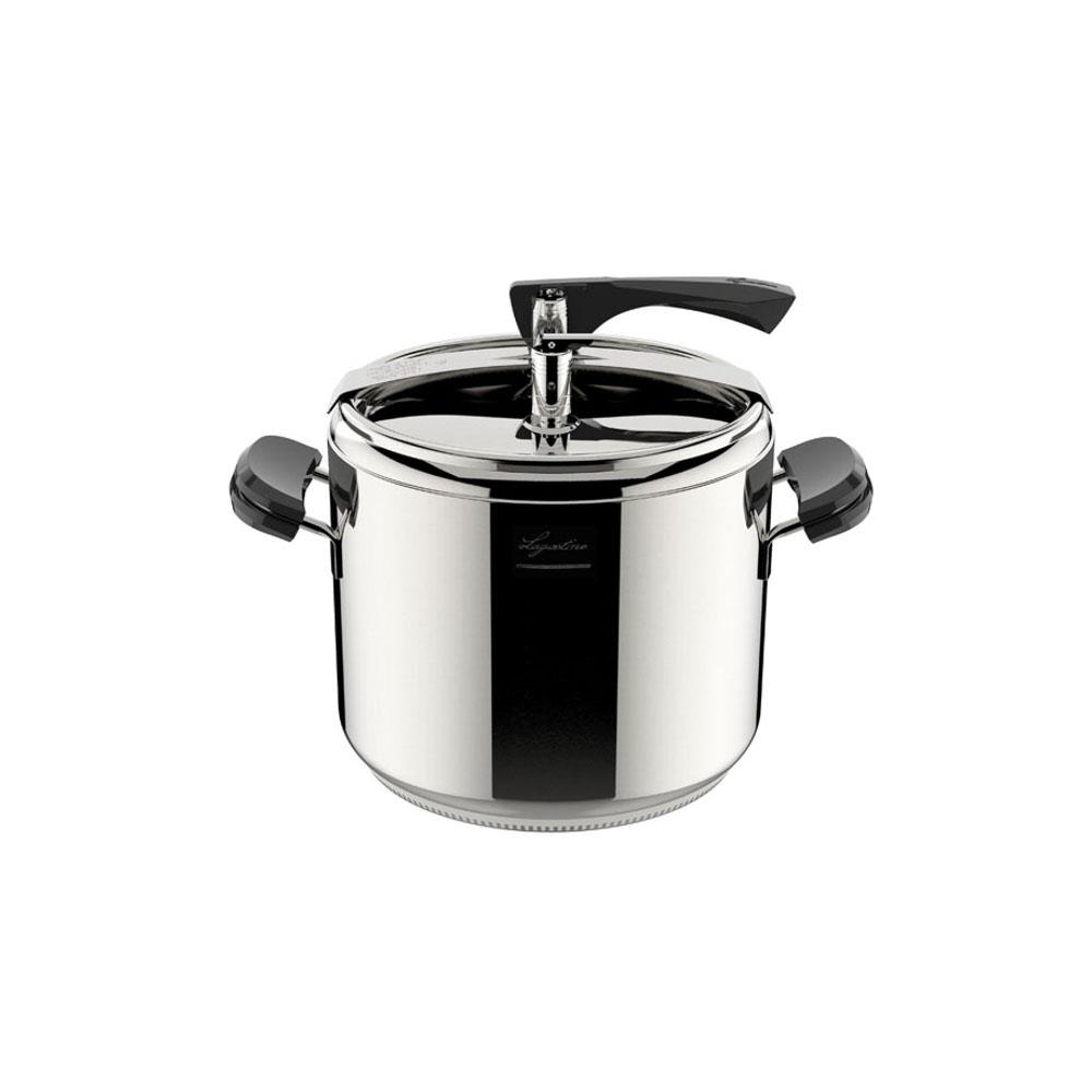 Acciaio inox - Fondo Lagofusion Valvola esercizioe valvola sicurezza Dispositivo controllo chiusura Adatta per induzione e tutte le fonti di calore Manici bakelite removibile Diametro cm 22 - Dotazione cestello a filo