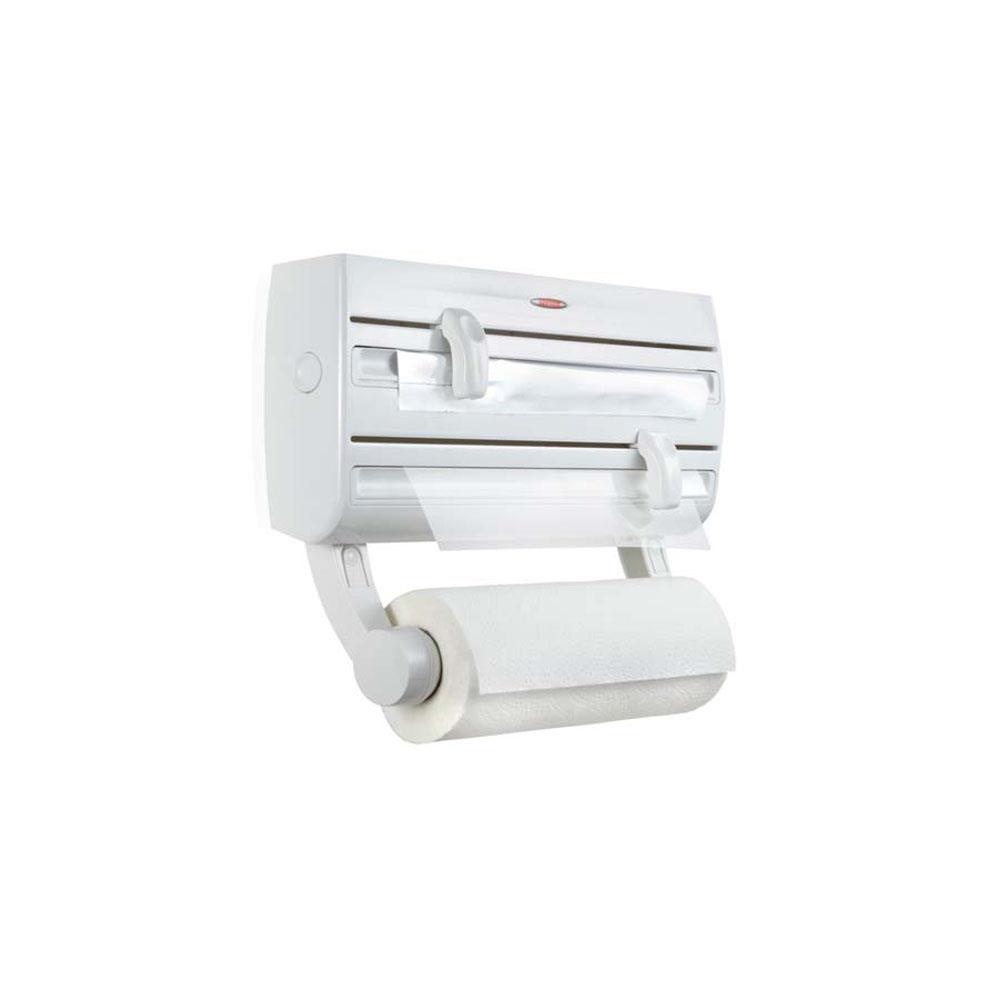Plastica A parete - Superficie appoggio per spezie Portarotolo 3 posti: carta, alluminio e pellicola Taglierini acciaio inox - Freno integrato Dimensioni cm 42x50 Rotolo carta non incluso Colore bianco