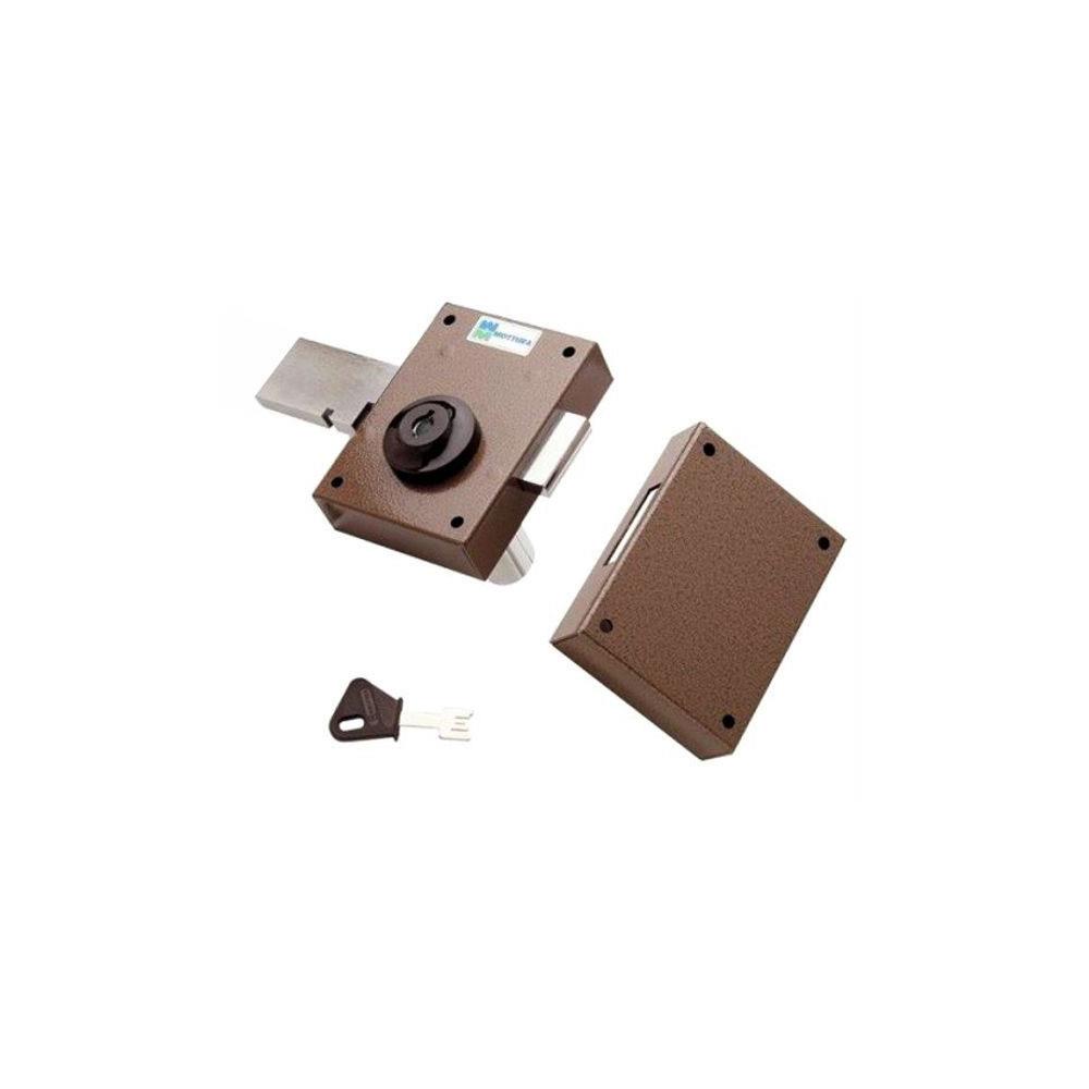Ferroglietto verniciato marrone - Applicare legnoCatenaccio 1 mandata chiave interna corsa mm 40 Scatola mm 90x121 - Entrata mm 45 Cilindro fisso a pompa mm 50 Dotazione 3 chiavi - Viti e minuteria inclusa