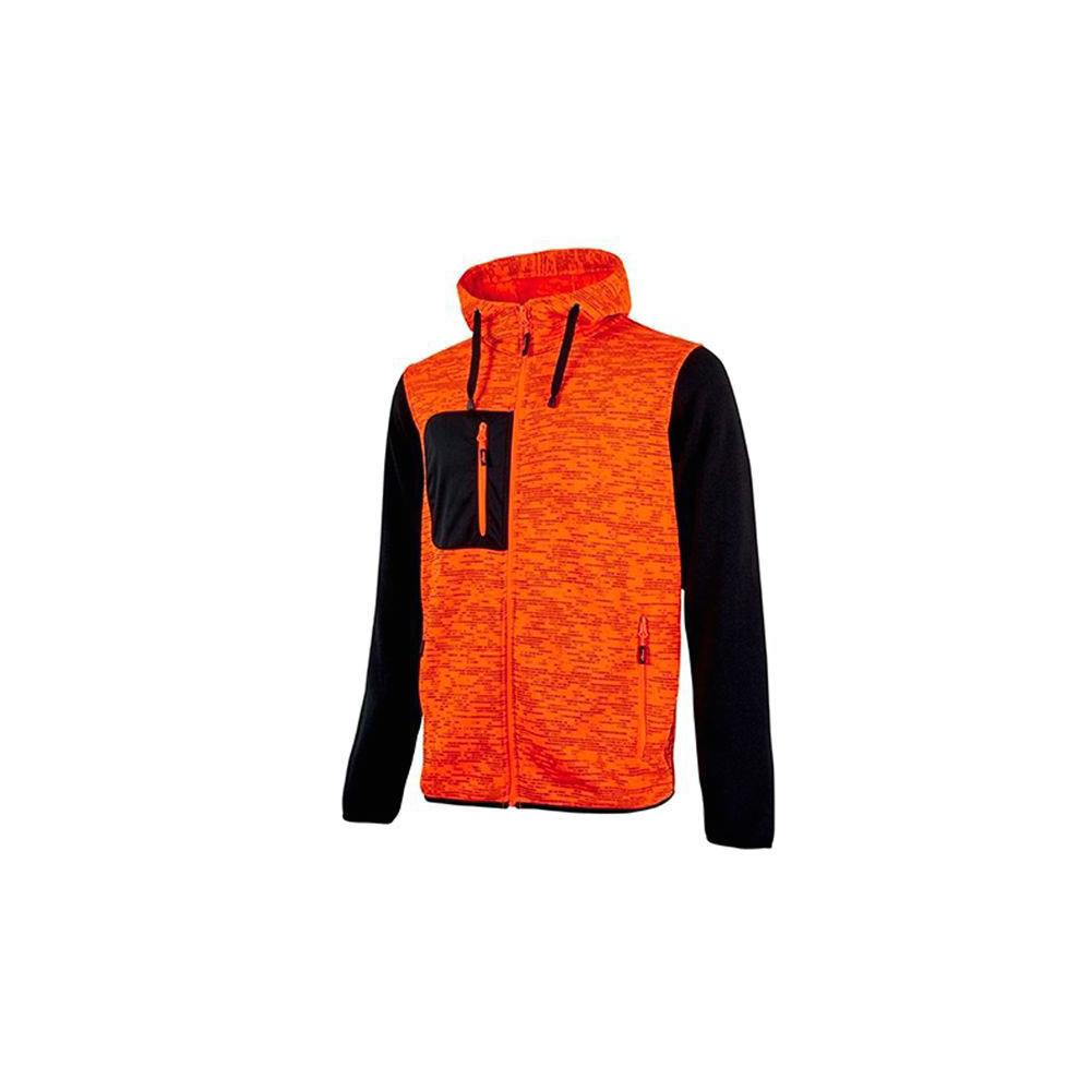 Poliestere 100% g/mq 310 Tessuto interno pile Chiusura zip lunga Polsi e fascia girovita maglia elastica Collo alto - Cappuccio regolabile 2 tasche frontali con zip Tasca portacellulare con zip Colore orange fluo