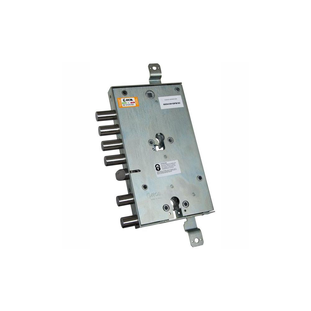 Serratura doppio cilindro europeo Infilare porte blindate - Movimento ad ingranaggi Trappola anti effrazione - Fori protettore mm 38 2 chiusure verticali Catenacci laterali 6 pistoni e scrocco reversibile Interasse catenacci mm 28 Scrocco azionato da maniglia quadro mm 8 e chiave Scatola mm 135x256x30 - Entrata mm 73 Cilindri e aste non compresi Compatibile serrature Atra e Mottura