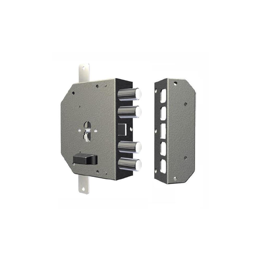 Serratura cilindro europeo applicare legno Trappola anti effrazione - Fori protettore mm 38 2 chiusure verticali Catenacci laterali 4 pistoni e scrocco Interasse catenacci mm 28 Scatola mm 130x164x51,5 - Entrata mm 60,5 Fornita con ferrogliera Aste e cilindro non inclusi