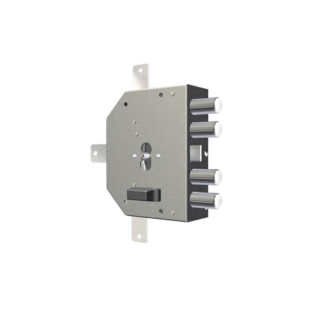 Serratura cilindro europeo applicare legno Trappola anti effrazione - Fori protettore mm 38 4 chiusure verticali Catenacci laterali 4 pistoni e scrocco Interasse catenacci mm 28 Scatola mm 130x164x51,5 - Entrata mm 60,5 Fornita con ferrogliera e deviatore Aste e cilindro non inclusi