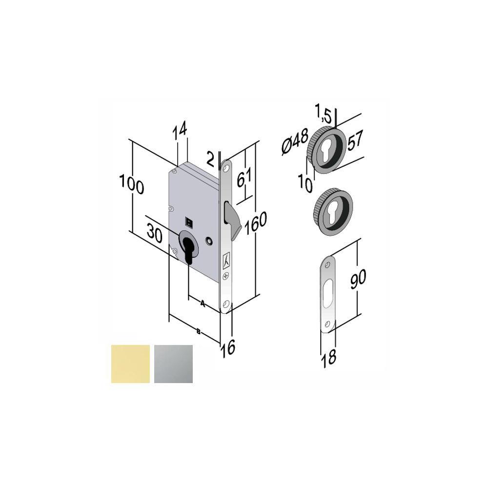 Serratura infilare porte scorrevoli Catenaccio a gancio Foro chiave cilindro europeo non incluso Frontale bordo tondo mm 16x160 Incontro mm 18x90 Scatola mm 70x100 spessore 13 - Entrata mm 50 Coppia maniglie tonde mm 48 incasso
