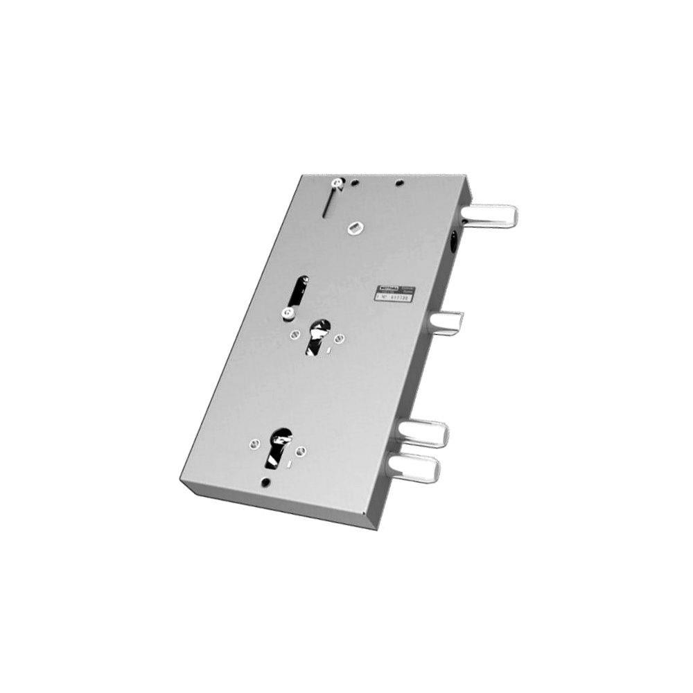 Serratura doppio cilindro europeo applicare legnoFori protettore mm 38 Catenacci laterali 3 pistoni e scrocco Interasse catenacci mm 27 Scatola mm 150x300x30 - Entrata mm 80 Cilindri e aste non compresi Fissaggio serratura su scatola filettata