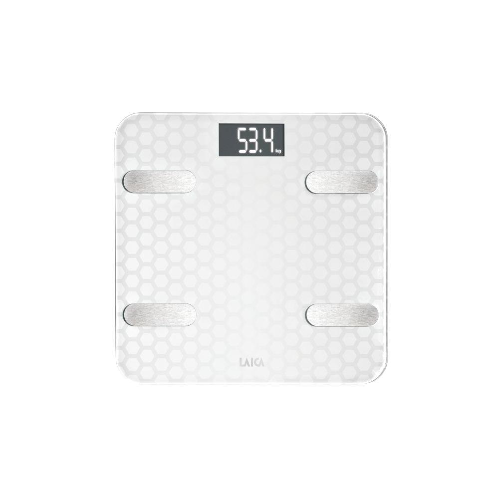 Plastica piatta - Piano vetro Suddivisione g 100 - Convertitore kg/Lb Display LCD Misurazione grasso, acqua, massa e fabbisogno calorico Funzione bluetooth Accensione/spegnimento automatico Alimentazione 2 pile AAA non incluse Dimensioni cm 30,0x30,0 h2,4 Garanzia 2 anni