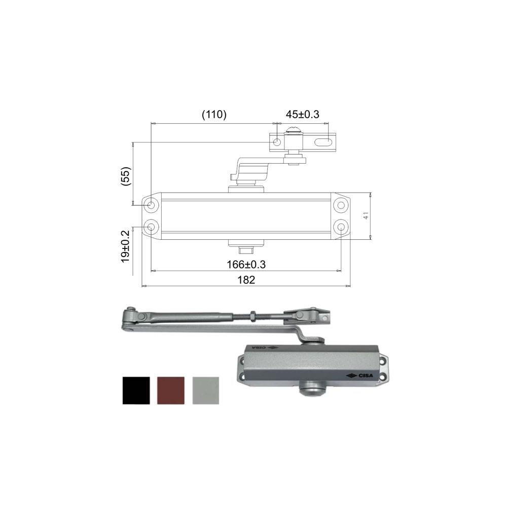 Corpo monoblocco lega alluminio - Multiforza Braccetto acciaio senza arresto Regolazione forza chiusura EN 2/3/4 Regolazione velocita' chiusura e forza colpo Lunghezza mm 182 - Profondita' mm 60