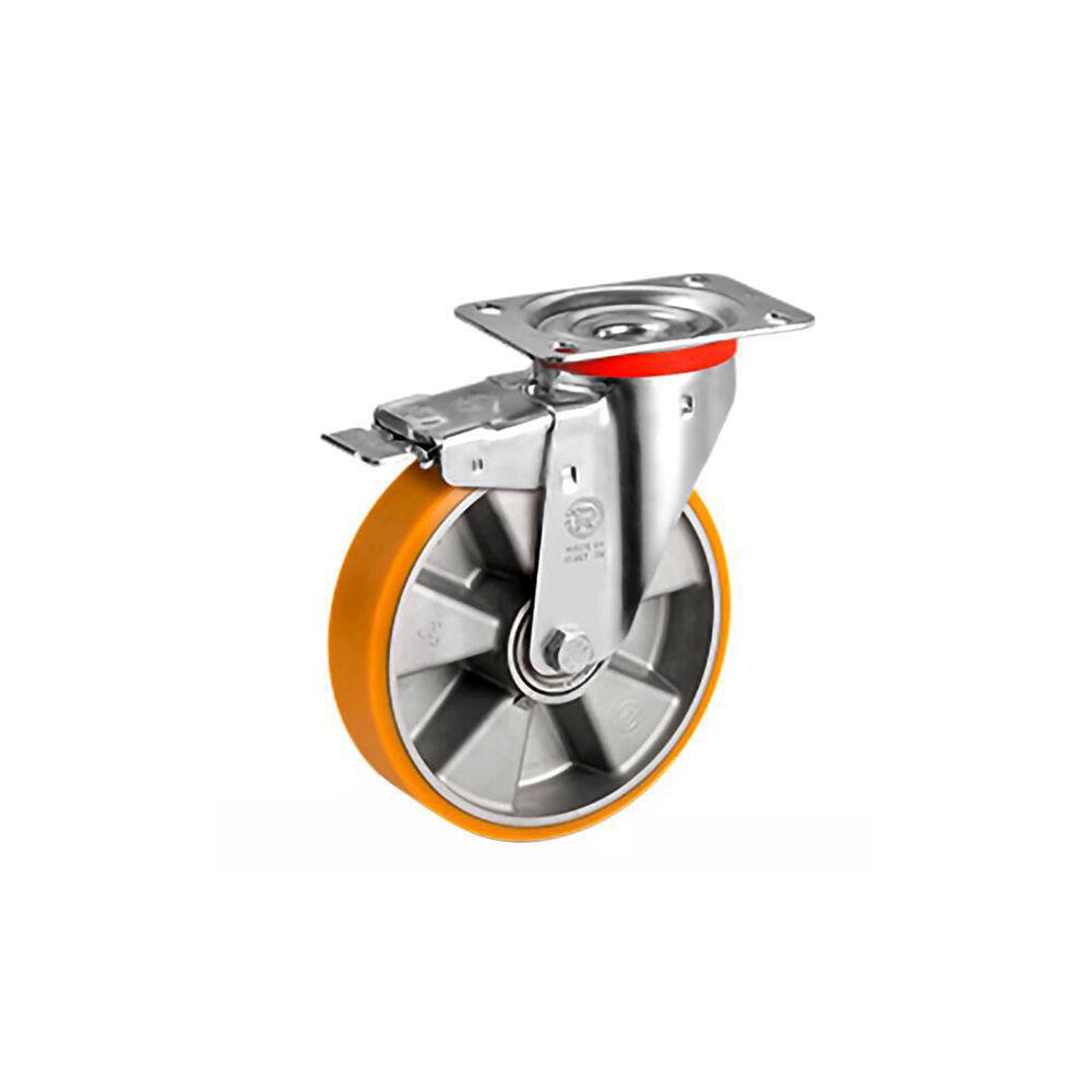 Ruota poliuretano TR - Supporto girevole Nucleo alluminio e ghisa meccanica Cuscinetti a sfera - Con freno d. 80 h 107 kg 200 d.100 h 128 kg 200 d.125 h 156 kg 220