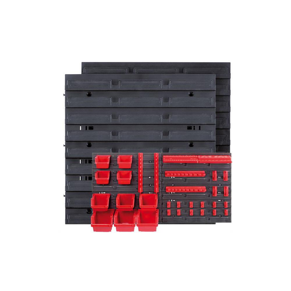 Composizione: 2 pannelli plastica mm 400x400 4 contenitori cm 115x80 h 60 3 contenitori cm 155x100 h 70 3 contenitori mm 195x120 h 90 1 supporto cacciaviti mm 185x105 1 supporto punte e inserti mm 185x105 1 supporto chiavi fisse 1 supporto brugole 20 ganci assortiti
