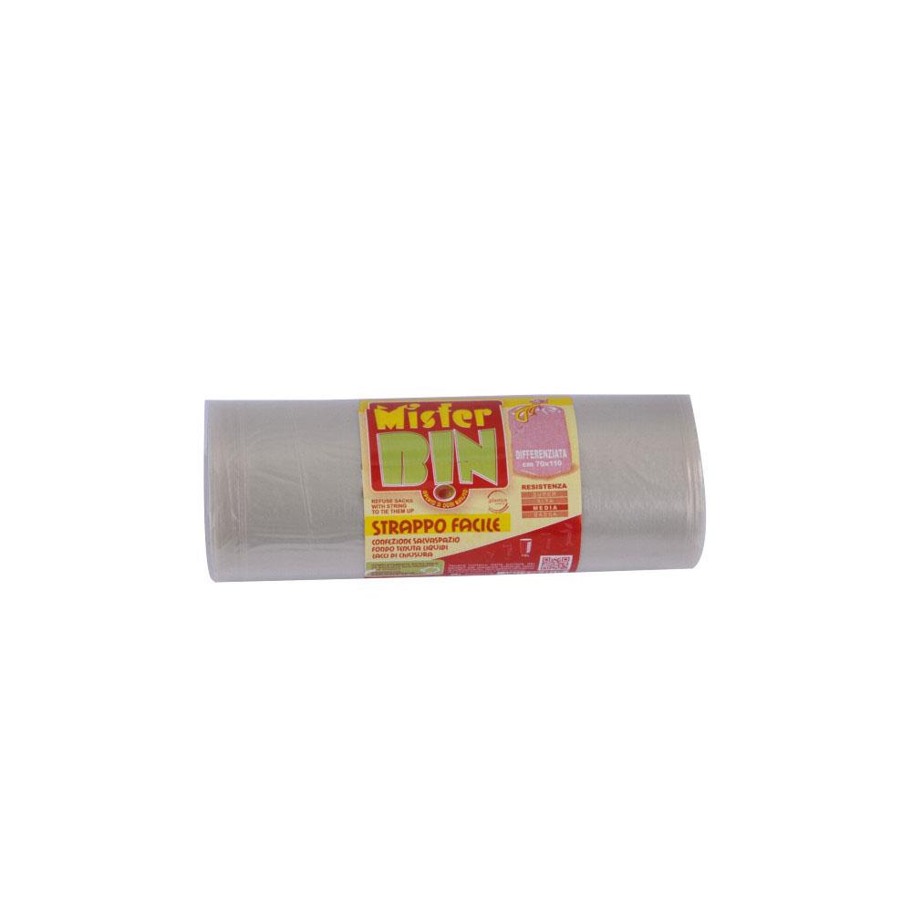 Materiale riciclato 100% - Resistenza media Fondotenuta liquidi - Saldatura a stella Lacci di chiusura - Confezione salvaspazio Dimensioni cm 50x 60 peso g 10 my 20 Dimensioni cm 70x110 peso g 30 my 20 Dimensioni cm 70x110 peso g 60 my 42