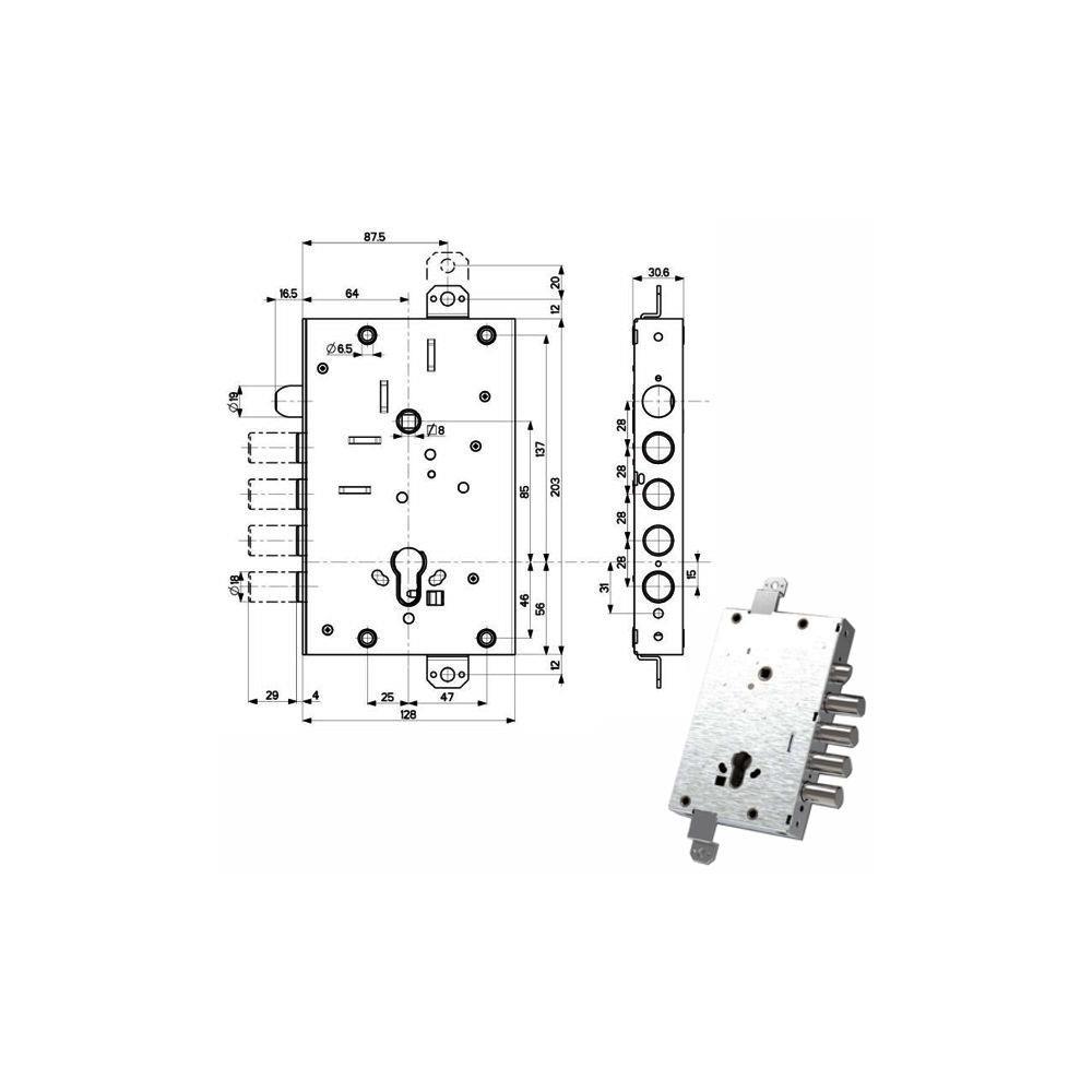 Serratura cilindro europeo a planare Trappola anti effrazione - Fori protettore mm 38Movimento ad ingranaggi 2 chiusure verticali Catenacci laterali 4 pistoni e scrocco Interasse catenacci mm 28 Scatola mm 128x203x31 - Entrata mm 64 Cilindro non incluso