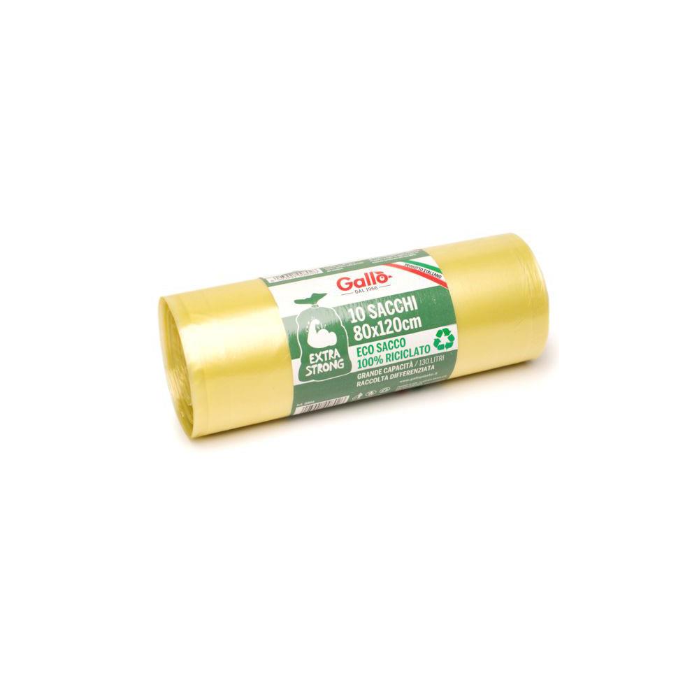 Materiale riciclato 100% - Resistenza media Fondotenuta liquidi - Saldatura a stella Lacci di chiusura - Confezione salvaspazio Dimensioni cm 80x120 peso g 60 my 35