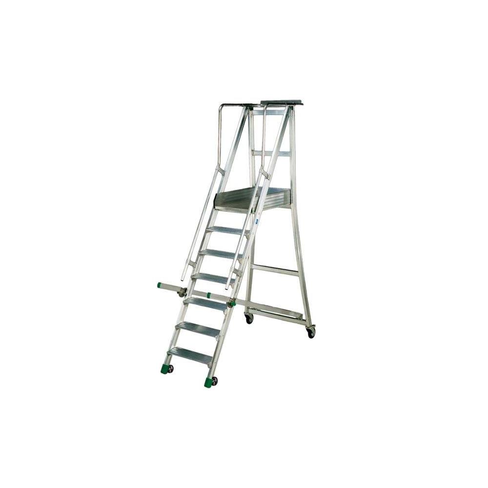 Alluminio - Modello a castello Sezione montanti mm 65x30 Gradini alluminio Larghezza gradini mm 150Pedana superiore cm 48x77 Vaschetta portaoggetti- Protezioni anticaduta Ruote anteriori mm 80 Ruote posteriori mm 125 con freno sicurezza Portata max kg 150 - EN 131 - DL 81/2008 - TUV GS