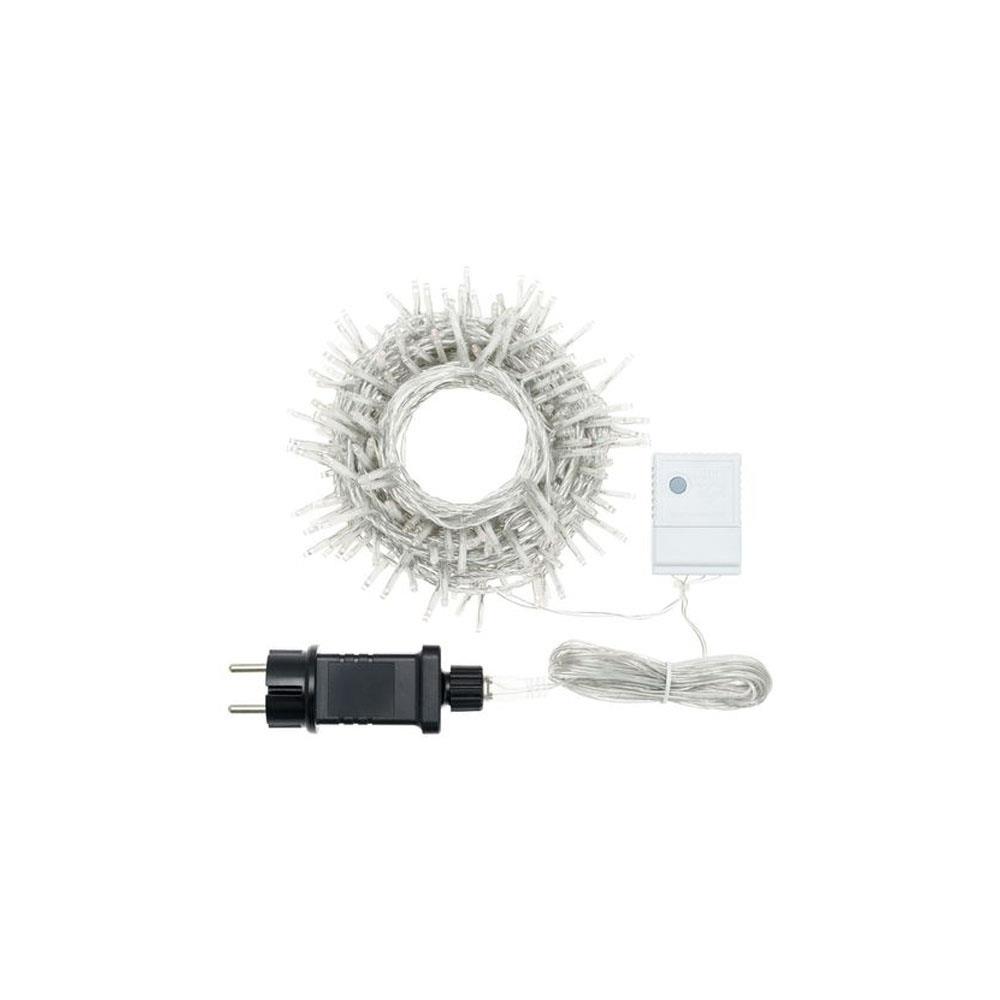 Cavo catena trasparente Led Reflex mini diametro mm 3,0 distanza cm 7 Numero led: 180 m 13,1 Luce fissa e 7 giochi di luce Timer 8/16 ore - Funzionememory Uso interno ed esterno - Grado protezione IP44 Lunghezza cavo alimentazione m 4,0 Alimentazione Volt 220