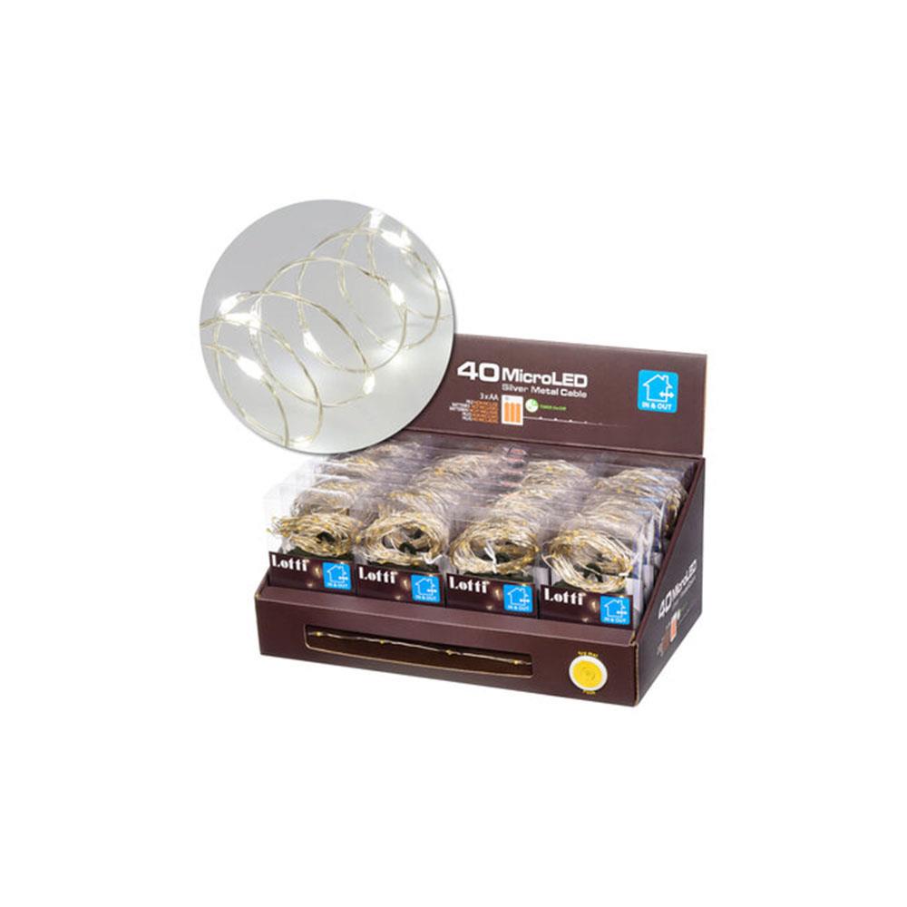 Cavo catena metallo colore argento Led micro diametro mm 1,5 distanza cm 10 Numero led: 40 m 3,9 -80 m 7,9 Luce fissa e 7 giochi di luce Timer 8/16ore - Funzione memory Uso interno ed esterno - Grado protezione IP44 Lunghezza cavo alimentazione m0,1 Alimentazione 3 pile AA incluse