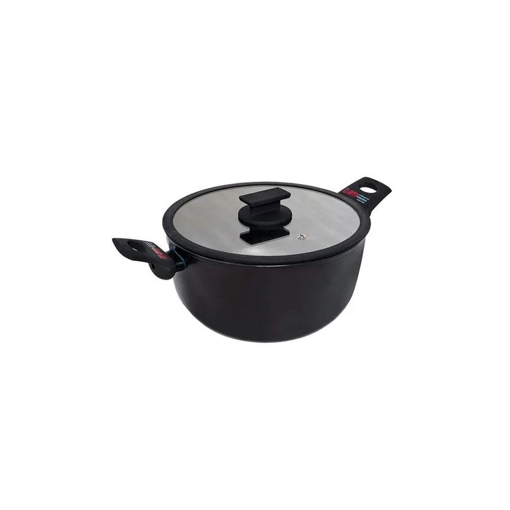 Alluminio - Spessore mm 3,5 Esterno lacca siliconica colore grigio Interno antiaderente AM Salus Hard System 7 strati Manici bachelite soft touch Coperchio vetro Adatta per induzione e tutte le fontidi calore Garanzia 2 anni