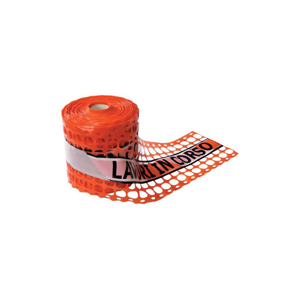 Plastica - Fori rettangolari Colore arancio Nastro rinfrangente centrale Scritta LAVORI IN CORSO Applicazione su reti cantiere o pannelli metallo Adatta per delimitazione cantieri