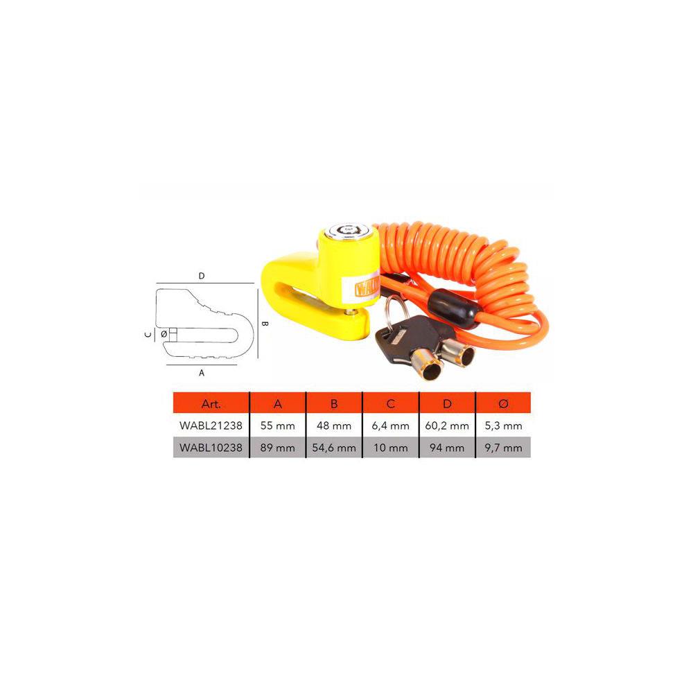 Corpo metallo verniciato Fissaggio su disco freniDiametro perno mm 5,3/9,7 Cavo memory acciaio ricoperto PVC mm 4x1500 Dotazione 2 chiavi a pompa testa plastica e cavo