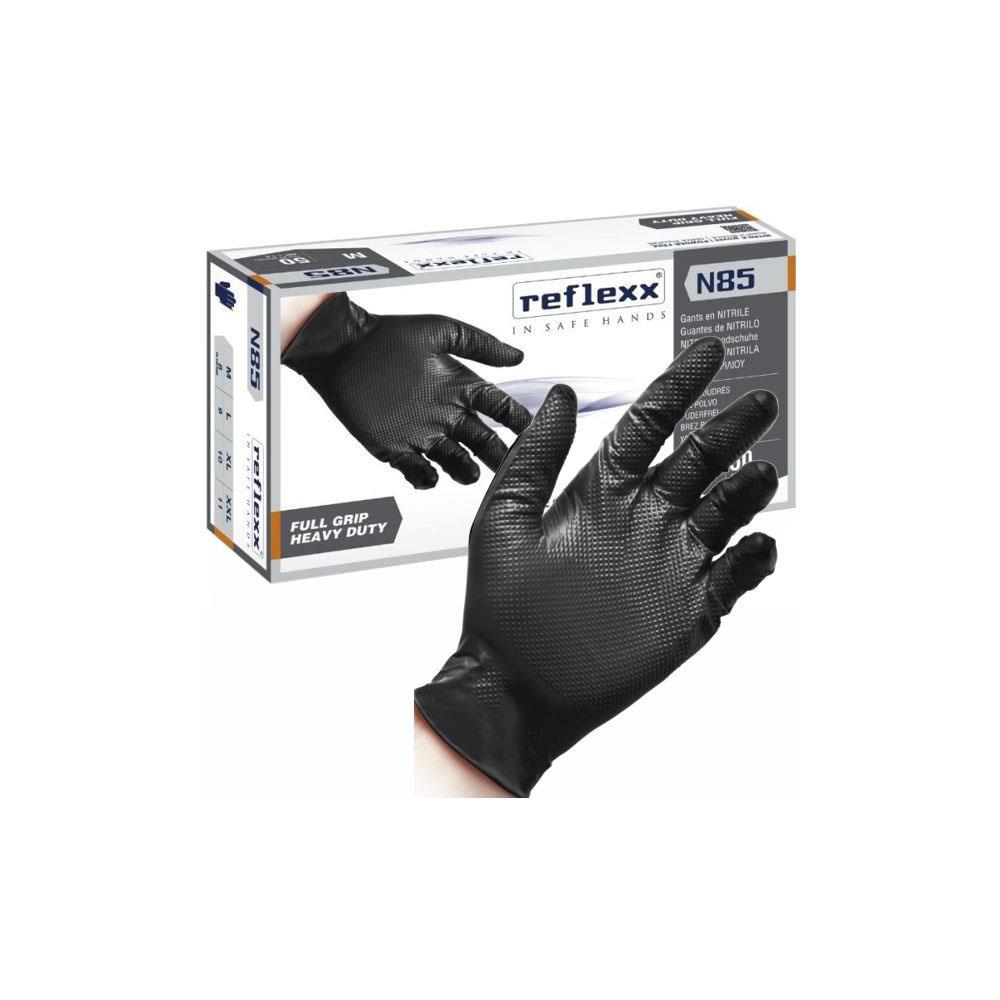 Nitrile - Monouso - Ambidestri Privi di talco - Internamente clorinati Non sterile - Superficie microruvida 3D full grip Peso g 8,4 +/- 0,4 Spessore mm 0,15 - Lunghezza mm 240 DPIclasse III Utilizzo settore industria Colore nero