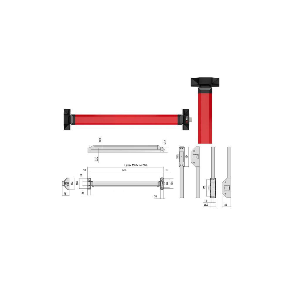 Maniglione uscite d'emergenza Carter alluminio verniciato nero Barra alluminio verniciato rosso Senza scrocco - Chiusura verticale Accorciabile fino a mm 300 Mano ambidestra - Lunghezza mm 840/1200