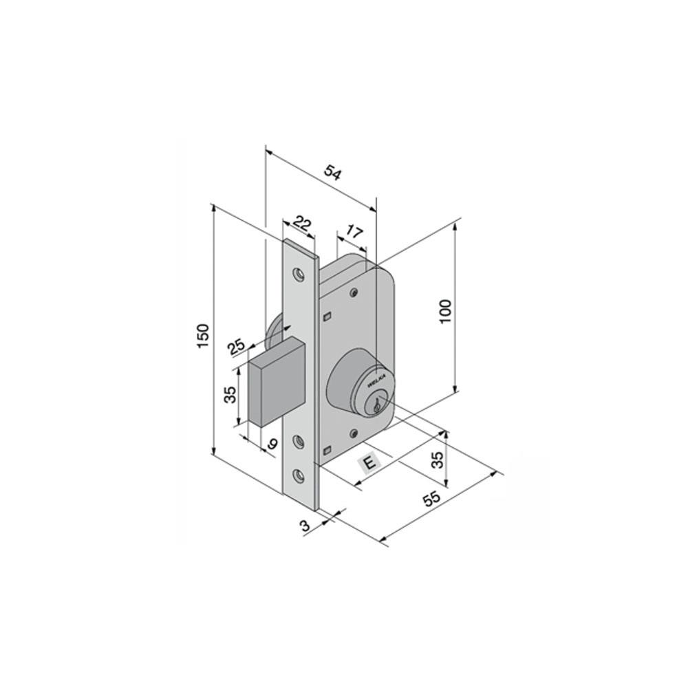 Serratura cancelli/porte ferro infilare Acciaio zincato Solo catenaccio Scatola mm 55x100 - Frontale mm 22x150 Entrata mm 30 - Cilindro serie 605.00.00