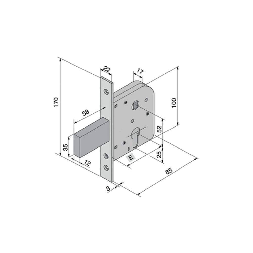 Serratura cancelli/porte ferro infilare Acciaio zincato tropicalizzato Scrocco - Mandata e mezza - Quadro mm 8 Scatola mm 85x100 - Frontale mm 22x170Entrata mm 50 - Cilindro serie 700 non incluso