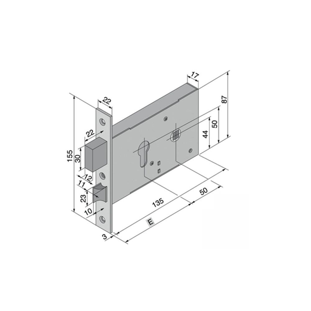 Serratura montanti alluminio infilare Acciaio zincato bianco - Catenaccio 2 mandate e scrocco reversibile - Quadro mm 8 Scatola mm 135x87 - Frontale mm 22x155 Entrata mm 50 - Cilindro serie 700 non incluso