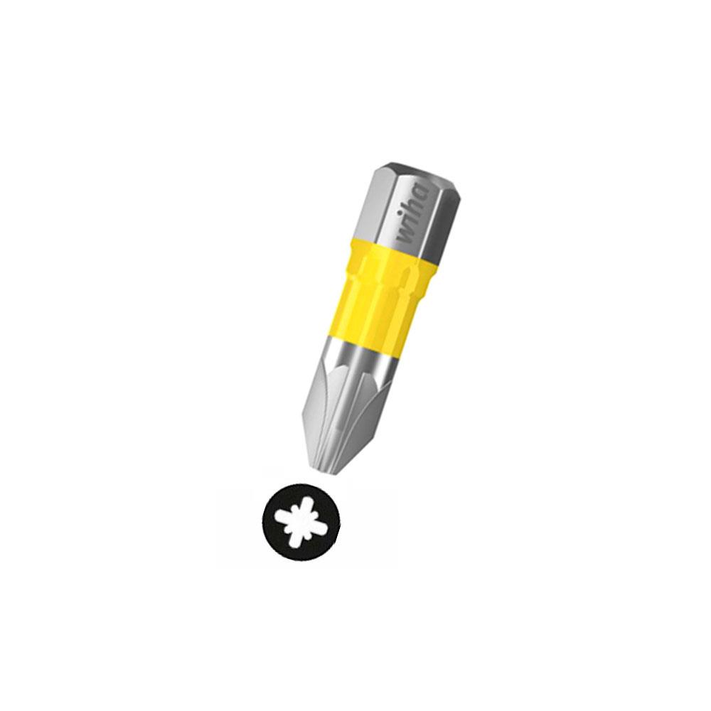 Inserto per viti croce pozidriv Acciaio brevettato torsione controllata Torsione massima 40^ Idealeper viti testa svasata Utilizzabili con avvitatore ad impulsi Segnalino giallo per facile individuazione Attacco 1/4" - Lunghezza mm 25